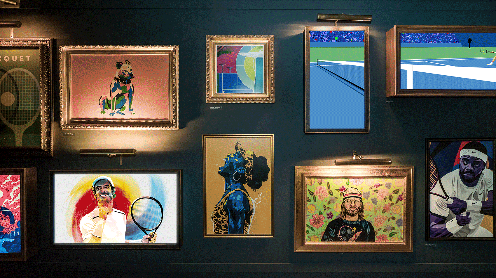 Along the side wall of the library resided the Gallery of Greats, moving and still portraits featuring tennis players and moments of the game, all depicted by artists Andy Gellenberg, Alvaro Tapia, Craig Frazier, and Racquet Magazine. Guests also enjoyed cocktails served from Please Don’t Tell’s mixologist Jim Meehan, and highlighted US Open collectible artifacts.